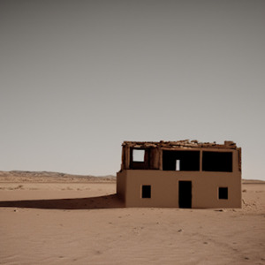 2023Huis in de woestijn een illustratie gemaakt door een coputer met AI bij het verhaal Zand.